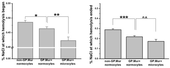 GP.Mur+ RBCs exhibited superior resistance to osmotic stress. Osmotic fragility tests showed that GP.Mur+ RBCs began and completed hemolysis at more hypotonic concentrations than non-GP.Mur cells. GP.Mur+ microcytes began hemolysis at even more hypotonic concentrations than GP.Mur+ normocytes, but GP.Mur+ microcytes and normocytes were not different in the %NaCl at which hemolysis terminated. Data are presented in mean ± SEM; * p < 0.05; ** p < 0.01; *** p < 0.001; n.s., not significant.