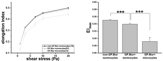 GP.Mur+ RBCs were less deformable than non-GP.Mur RBCs and GP.Mur+ microcytes were least deformable compared to normocytes. Left: The elongation indices increased as the given shear stresses increased. The number of subjects tested per group is indicated in the parentheses in the legend box. Right: All three groups were significantly different from one another; *** p < 0.001.