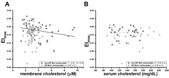 The rigidifying effects of membrane cholesterol on red cell deformability were significant in non-GP.Mur RBCs but not in GP.Mur+ RBCs. Each dot represents the data of a subject with normal RBC sizes. The impacts of (A) membrane cholesterol and (B) serum cholesterol on maximal elongation indices (EImax) are presented. Significant linear fitting (* p < 0.05) is presented using a solid line, poor or failed linear fitting (p > 0.05) in thin dashed lines. n.s., not significant.