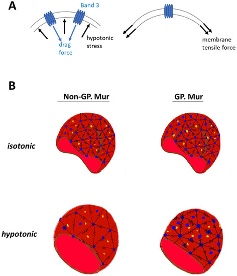 The erythrocyte membrane structure evolved to endure forces during ~120 days of circulation. Without band 3 protein embedded in the membrane, erythrocytes would not have the biconcave shape [35]. From the mechanical viewpoint, the deformability test applies physical stress to increase lateral membrane tension (Figure 4A, right). Band 3 embedded in the cell membrane is a disruption to the lateral tension exerted onto the membrane, with its dispersed location and distinctively different material properties from the lipid bilayer. The osmotic fragility test adds hypotonic stress to the cell membrane, and a drag force is expected to act on the membrane in the opposite direction (Figure 4A, left). Cell swelling under the hypotonic stress also increases lateral membrane tension mentioned above (Figure 4A, right). If we envision the frame of a red cell as polymer chains using the bead–spring model [36,37], band 3 (blue beads in Figure 4B) endures drag force that acts on the RBC membrane. Submembranous spectrins (black springs in Figure 4B) provides elasticity to the membrane. Band 3 protein complexes and their linked cytoskeletal network strengthen the cell membrane against the forces imposed parallel and perpendicular to the cell membrane. With more band 3 molecules, GP.Mur+ RBCs can first resist stronger external force than non-GP.Mur cells, and thus were less deformable and osmotically more resistant. Second, the stronger AQP1-band 3 interaction on the GP.Mur+ cell membrane could impose additional regulation on water permeation and constrain the degree of cell swelling through band 3 interaction with ankyrin and adduction complexes (parts of the spectrin network) [19,21,22]. The importance of water channel in osmotic resistivity of RBCs was revealed when comparing GP.Mur and non-GP.Mur in this study. These two properties of band 3 complexes could thus explain why the degrees of changes in deformability and osmotic fragility appeared independent from each other (Table 3 and Table 6).