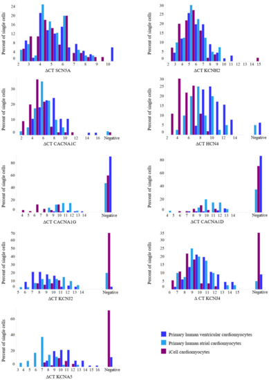 Histograms of expression parameters. Comparisons of distributions of single-cell expression data (ΔCT) between atrial and ventricular human primary cardiomyocytes and iCell cardiomyocytes. For total n see Table 3. While for some ion channels (SCN5A, KCNH2, CACNA1C, and KCNJ4) the distributions between primary human atrial and ventricular cardiomyocytes are comparable, the distributions of HCN4, CACNA1D, CACNA1G, and KCNA5 are left-shifted (higher expression) in primary human atrial cardiomyocytes compared to primary human ventricular cardiomyocytes. With respect to KCNJ2, distribution is left-shifted (higher expression) for human primary ventricular cardiomyocytes compared to their atrial counterpart. Comparing distributions between the two primary cardiomyocyte groups and iCell cardiomyocytes shows a shift to the left (higher expression) for the pacemaking-associated ion channels HCN4, CACNA1G, and CACNA1D in iCell cardiomyocytes.