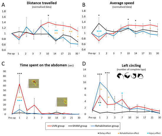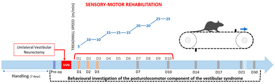 - Rastoldo, G.; Marouane, E.; El Mahmoudi, N.; Péricat, D.; Bourdet, A.; Timon-David, E.; Dumas, O.; Chabbert, C.; Tighilet, B. Quantitative Evaluation of a New Posturo-Locomotor Phenotype in a Rodent Model of Acute Unilateral Vestibulopathy. Front. Neurol. 2020, 11, 505. [Google Scholar] [CrossRef] [PubMed]