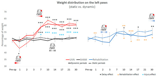 - The weight distribution on the left paws (static vs. dynamic), which represents the percentage of weight the animal applies on its left paws. In healthy animals, this percentage is equally distributed between right and left.