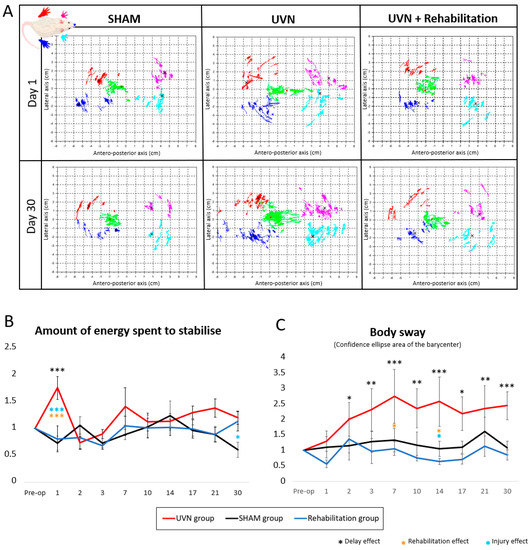 - Marouane, E.; Rastoldo, G.; El Mahmoudi, N.; Péricat, D.; Chabbert, C.; Artzner, V.; Tighilet, B. Identification of New Biomarkers of Posturo-Locomotor Instability in a Rodent Model of Vestibular Pathology. Front. Neurol. 2020, 11, 470. [Google Scholar] [CrossRef] [PubMed]