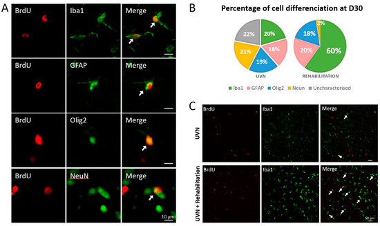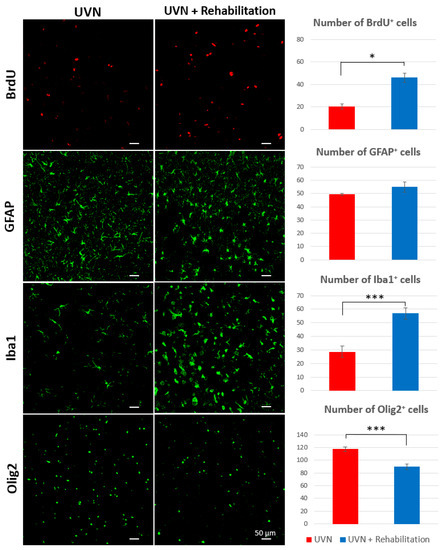 - Dutheil, S.; Brezun, J.M.; Leonard, J.; Lacour, M.; Tighilet, B. Neurogenesis and astrogenesis contribution to recovery of vestibular functions in the adult cat following unilateral vestibular neurectomy: Cellular and behavioral evidence. Neuroscience 2009, 164, 1444–1456. [Google Scholar] [CrossRef]