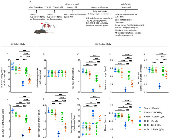 This study was conducted in compliance with established guidelines and prevailing protocol (S01754) as approved by the Institutional Animal Care and Use Committee (IACUC) at the University of California, San Diego in accordance with the National Institutes of Health, Bethesda, MD, USA. Male c57BL/6 J mice at 6 weeks of age were used for the study. CKD in mice was surgically induced by two-stage 5/6 nephrectomy while a sham procedure was performed in control mice [12]. Mice were housed with 12:12 h light-dark cycles with ad libitum access to mouse diet 5015 (LabDiet, St Louis, MO, USA, catalog 0001328, with a metabolizable energy value of 3.59 kcal/g) and water prior to the initiation of the experiment. We have performed a series of experiments to determine the minimum dose of 25(OH)D3, and 1,25(OH)2D3 in order to replenish the serum levels of those molecules in CKD mice. CKD mice were treated with 25(OH)D3 (Sigma, Northbrook, IL, USA, Catalog 739,650-1ML, 25, 50 or 75 μg/kg/day), 1,25(OH)2D3 (Sigma, Northbrook, IL, USA, Catalog 740,578-1ML, 20, 40 or 60 ng/kg/day) or vehicle (ethylene glycol) using a subcutaneous osmotic Alzet mini-osmotic pump model 2006 (Durect Corporation, Cupertino, CA, USA). Results are shown in Table 1, Table 2 and Table 3. Subsequently, we have performed the following two studies to investigate the differential effects of 25(OH)D3 versus 1,25(OH)2D3 repletion in CKD mice. The schematic study plan for these two studies is illustrated in Figure 1A. Study 1—CKD and sham mice were treated with 25(OH)D3 (75 μg/kg/day), 1,25(OH)2D3 (60 ng/kg/day), or vehicle. The study period was 6 weeks and all mice were housed in individual cages and had free access to the rodent diet. Mice were sacrificed at 14 weeks of age. We compared caloric intake and weight change in CKD and sham mice. The caloric intake for each mouse was calculated by multiplying total mouse diet consumption (in grams) with the metabolizable energy value of the diet (3.59 kcal/g). The result for energy intake is expressed as kcal/mouse/day. Study 2—we evaluated the effects of 25(OH)D3 and 1,25(OH)2D3 in CKD mice, beyond nutritional stimulation by employing a pair-feeding strategy. CKD and sham mice were given 25(OH)D3 (75 μg/kg/day), 1,25(OH)2D3 (60 ng/kg/day) or vehicle for 6 weeks. Vehicle-treated CKD mice were fed ad libitum while all other groups of mice were fed an equal amount of rodent diet based on the recorded food intake of vehicle-treated CKD mice. Each mouse was housed in an individual cage. We measured the weight change for each mouse. Mice were sacrificed at 14-weeks of age.