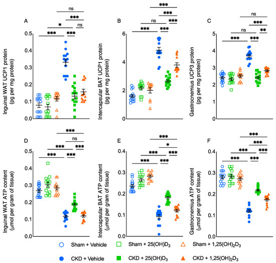 Repletion of 25-hydroxyvitamin D3 ameliorates energy homeostasis in adipose tissue and skeletal muscle in CKD mice. UCP and ATP content in adipose tissue (inguinal WAT and intercapsular BAT) and gastrocnemius muscle was measured. Data are expressed as mean ± SEM. Results of CKD + Vehicle, CKD + 25(OH)D3 and CKD + 1,25(OH)2D3 mice were compared to those of Sham + Vehicle, Sham + 25(OH)D3 and Sham + 1,25(OH)2D3 mice, respectively. In addition, results of CKD + Vehicle were compared to those of CKD + 25(OH)D3 and CKD + 1,25(OH)2D3 mice, respectively. Furthermore, results of CKD + 25(OH)D3 mice were compared to those of CKD + 1,25(OH)2D3 mice. Specific p-values are shown above the bar. ns: signifies not significant, ∗ p < 0.05, ∗∗ p < 0.01, ∗∗∗ p < 0.001.