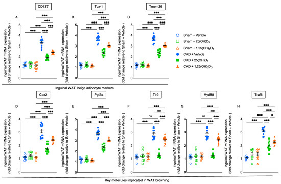 Recent data suggest that WAT browning contributes to energy-wasting in cachexia. White, beige and brown adipocytes are distinct but often occur mixed together within individual depots [3,4,5]. In CKD mice, repletion of 25(OH)D3 significantly decreased inguinal WAT expression of beige adipocyte cell surface markers (CD137, Tbx1 and Tmem26), and the effect was significantly stronger than observed with 1,25(OH)2D3 repletion (Figure 3A–C). Cox2/Pgf2α induces de novo browning recruitment in WAT. Activation of toll-like receptor Tlr2 and their adaptor molecules, such as Myd88 and Traf6 stimulate browning of WAT [24]. We showed that repletion of 25(OH)D3 significantly decreased inguinal WAT expression of Cox2, Pgf2α, Tlr2, Myd88 and Traf6 in CKD mice and that the effect was significantly stronger than seen with 1,25(OH)2D3 repletion in CKD mice (Figure 3D–H).