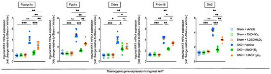 Inguinal WAT of CKD mice displayed significantly increased thermogenesis gene expression (Ppargc1α, Pgc1α, Cidea, Prdm16, and Dio2) relative to sham mice. Repletion of 25(OH)D3 normalized inguinal WAT (Ppargc1α, Pgc1α, and Dio2) or attenuated (Cidea and Prdm16) gene expression in CKD mice (Figure 4).