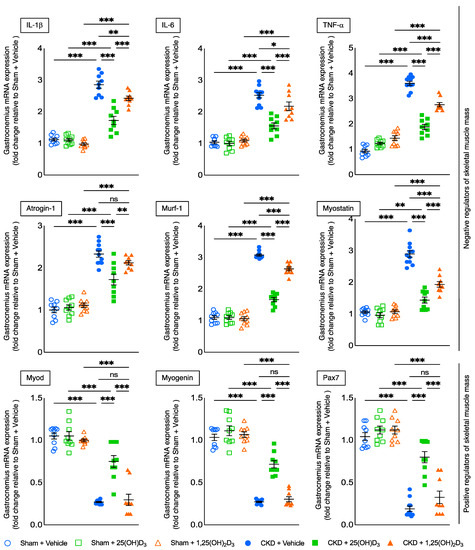Repletion of 25-hydroxyvitamin D3 attenuates signaling pathways implicated in muscle wasting in CKD mice. Gastrocnemius muscle expression of negative regulators of skeletal muscle mass (Atrogin-1, Murf-1, Myostatin, IL-1β, IL-6 and TNF-α), as well as pro-myogenic factors (Myod, Myogenin and Pax7), were measured by qPCR. Final results were expressed in arbitrary units, with one unit being the mean level in Sham + Vehicle mice. Data are expressed as mean ± SEM. Results of CKD + Vehicle, CKD + 25(OH)D3 and CKD + 1,25(OH)2D3 mice were compared to those of Sham + Vehicle, Sham + 25(OH)D3 and Sham + 1,25(OH)2D3 mice, respectively. In addition, results of CKD + Vehicle were compared to those of CKD + 25(OH)D3 and CKD + 1,25(OH)2D3 mice, respectively. Furthermore, results of CKD + 25(OH)D3 mice were compared to those of CKD + 1,25(OH)2D3 mice. Specific p-values are shown above the bar. ns: signifies not significant, ∗ p < 0.05, ∗∗ p < 0.01, ∗∗∗ p < 0.001.