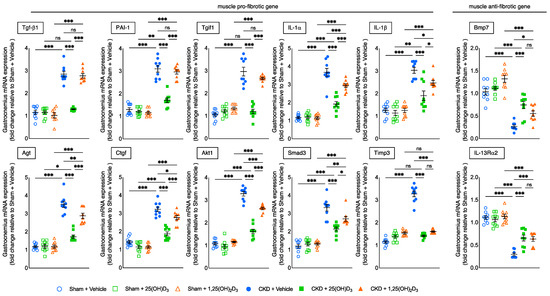 Repletion of 25-hydroxyvitamin D3 attenuates gastrocnemius muscle fibrotic gene expression in CKD mice. Repletion of 25-hydroxyvitamin D3 normalized muscle expression of pro-fibrotic genes (Tgfα1, Tgif1, Timp3) as well as attenuated pro-fibrotic genes (PAI-1, IL-1α, IL-1β, Agt, Ctgf, Akt1 and Smad3) and anti-fibrotic genes (Bmp7 and IL-13Rα2) of the gastrocnemius in CKD + 25(OH)D3 mice. Gene expression of fibrotic genes in gastrocnemius muscle was measured by qPCR. Final results were expressed in arbitrary units, with one unit being the mean level in Sham + Vehicle mice. Data are expressed as mean ± SEM. Results of CKD + Vehicle, CKD + 25(OH)D3 and CKD + 1,25(OH)2D3 mice were compared to those of Sham + Vehicle, Sham + 25(OH)D3 and Sham + 1,25(OH)2D3 mice, respectively. In addition, results of CKD + Vehicle were compared to those of CKD + 25(OH)D3 and CKD + 1,25(OH)2D3 mice, respectively. Furthermore, results of CKD + 25(OH)D3 mice were compared to those of CKD + 1,25(OH)2D3 mice. Specific p-values are shown above the bar. ns: signifies not significant, ∗ p < 0.05, ∗∗ p < 0.01, ∗∗∗ p < 0.001.
