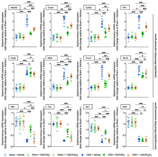 We performed RNAseq analysis on gastrocnemius muscle mRNA in 12-month-old CKD mice versus age-appropriate sham mice. Detailed procedures for mRNA extraction, purification and subsequent construction of cDNA libraries as well as analysis of gene expression were published [12]. We then performed Ingenuity Pathway Analysis enrichment tests for those differentially expressed muscle genes in 12-month-old CKD mice versus sham mice, focusing on pathways related to energy metabolism, skeletal and muscle system development and function, and organismal injury and abnormalities. We identified the top 12 differentially expressed muscle genes in 12-month-old CKD mice versus sham mice. In this study, we evaluated the differential effects of 25(OH)D3 versus 1,25(OH)2D3 repletion on the expression of these 12 differentially expressed gastrocnemius muscle genes for the following six groups of younger mice (3 months of age at sacrifice), i.e., Sham + Vehicle, Sham + 25(OH)D3, Sham + 1,25(OH)2D3, CKD + Vehicle, CKD + 25(OH)D3 as well as CKD + 1,25(OH)2D3 by qPCR technique.