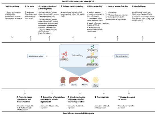 Summary of the metabolic advantages of repletion of 25(OH)D3 over repletion of 1,25(OH)2D3 on serum chemistry, cachexia, energy expenditure and thermogenesis, adipose tissue browning and muscle wasting in CKD mice. Created with BioRender.com, accessed 7 September 2021.