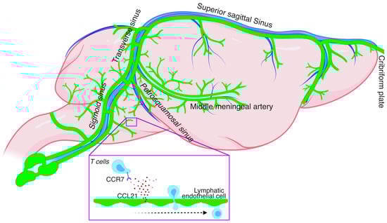 Scheme of rodent meningeal lymphatic network and CCR7-dependent T cell entry into the meningeal lymphatic vessel.