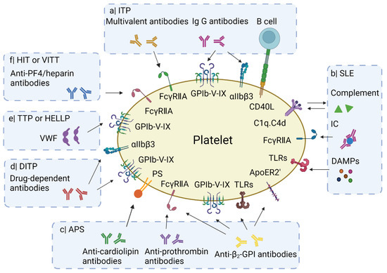 In the present review, we summarize reported key mechanisms of platelet activation (Figure 1), in particular focusing on idiopathic thrombocytopenic purpura (ITP), systemic lupus erythematosus (SLE), antiphospholipid syndrome (APS), drug-induced thrombocytopenia (DITP), heparin-induced thrombocytopenia (HIT), thrombotic thrombocytopenia purpura (TTP), hemolysis, elevated liver enzymes and low platelets (HELLP) syndrome, and COVID-19 vaccine-induced thrombosis with thrombocytopenia (VITT). In addition, we list the reported mechanisms of platelet destruction in these immune disorders (Figure 2). For each pathology, we also present information on disease type, description, bleeding vs. thrombosis and implicated genes in a tabular form (Supplementary Table S1). We furthermore compiled information on the clinical phenotype and symptoms, blood abnormalities, treatment options, and platelet phenotypes (Supplementary Table S2).
