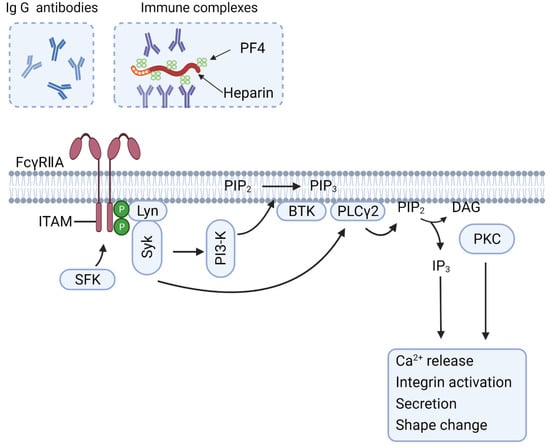 FcγRIIA-induced platelet activation and signaling pathways. IgG antibodies or larger immune complexes can activate platelets by dimerization or clustering of FcγRIIA receptors. The tyrosine-based activation motif (ITAM) is then phosphorylated by Src-family kinases (SFK), recruiting and phosphorylating the tyrosine kinase Syk, which in turn activates phosphoinositide 3-kinase (PI3K). The production of phosphatidylinositol-3,4,5-trisphosphate (PIP3) recruits Bruton’s tyrosine kinase (BTK) and phospholipase Cγ (PLCγ), which leads to activation of downstream responses via IP3 production and protein kinase C (PKC). The extent of platelet activation is likely dependent on the type of IgG antibodies and immune complexes. Created with BioRender.com.