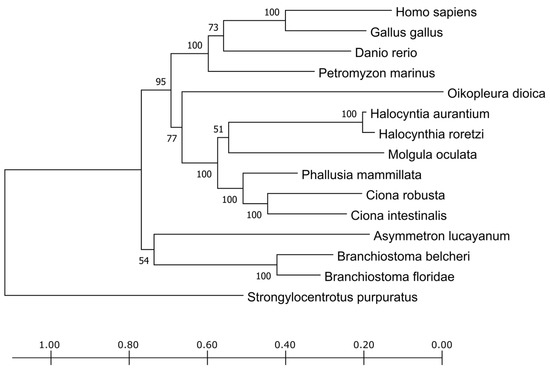A single protein from the TPO class was found in all of the species here considered (Supplementary Materials File S1). The protein sequence lengths for both vertebrate and non-vertebrate chordates ranged from 549 aa (for P. mammillata) to 1415 aa (for B. belcheri); the second longest sequence was from M. oculata (970 aa long) and resulted in an alignment of 1651 positions (Supplementary Materials Figure S1). The trimmed alignment consisted of 962 phylogenetically informative sites (Supplementary Materials Figure S2). The aligned sequences showed an average identity of 34.79% ± 11.08%, ranging from 18.2% (in the comparison between B. belcheri and Phallusia fumigata) to 82.3% (among the two Halocynthia species).