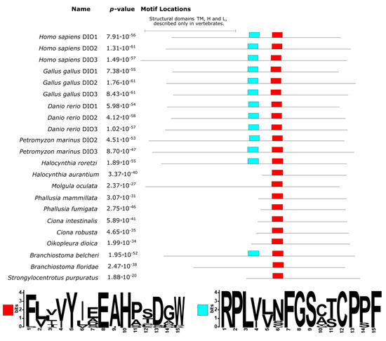 The three DIOs show a similar organization in vertebrates, consisting of four domains: an N-terminal transmembrane domain (TM), a hinge (H), a linker (L), and a globular domain with catalytic function (G) [30]. The latter is the most conserved one, whereas the former three are located in the region at the N-terminal, which is more variable [30]. Another conserved domain, according to Orozco et al. (2012), is implicated in the deiodinase dimerization domain [30]. The proteins from non-vertebrate chordates, however, apparently do not possess TM, H, and L domains. These proteins were generally shorter than the ones from vertebrates. In particular, the sequences from the two Ciona and Phallusia—H. aurantium and O. dioica—were missing almost half of the protein sequence at the N-terminal (Figure 5). The analysis of conserved domains found two conserved domains, one with the motif RPLYXXFGS (light blue box in Figure 5) that corresponded to the G domain in vertebrates. Another conserved domain was located downstream and had the motif (V/I)YXEAH (red box in Figure 5), corresponding to the dimerization domain of vertebrates. While the former was not found in all species, the latter was ubiquitous. Interestingly, the RPLYXXFGS motif was found in all vertebrates in H. roretzi and B. belcheri and, hence, the presence of an active homologue of the vertebrates iodothyronine deiodinase was, for the first time, experimentally demonstrated in non-vertebrate chordates precisely for the ascidian species H. roretzi [9]. Another question mark is the absence of the G domain in all tunicate species and two out of three cephalochordates. This suggests that the G domain is crucial for protein functioning in vertebrates, but the homologous proteins in protochordates may possess different catalytic sites. Further investigation of the structural gene annotation of tunicates is required to deeply investigate this aspect.