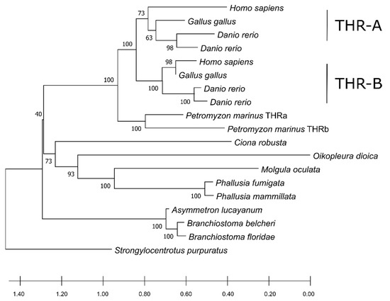 The phylogenetic tree shows a distinct clustering pattern in the vertebrates, separating the two paralogues in a similar fashion to the DIOs. C. robusta constituted an independent-one-taxon branch from the remaining group of Ascidiacea, where Branchiostoma spp. was the outgroup of other chordates (Figure 6). Moreover, the two THR paralogues in P. marinus had a similarity score of 68.4% and grouped together but did not cluster with neither the vertebrates THRa nor THRb. This fact could point to a separate duplication event that gave rise to two copies of THR and probably occurred in the common ancestor of lampreys. We detected a single ortholog in non-vertebrate chordates in THRs as well. This suggests that the duplication of the THR is also associated with the emergence of a more complex physiology and anatomy of vertebrates, i.e., THRs required a more subtle modulation of gene expression in different moments of metamorphosis in Xenopus laevis [32]. This further confirms that a higher number of paralogues in this regulatory pathway led to greater tissue diversification in vertebrates.