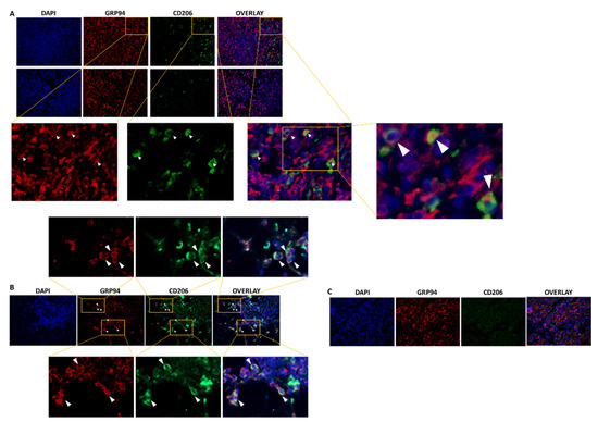 We first used immunofluorescence to confirm previous preliminary results showing the presence of CD206+ M2-like macrophages in 4T1 biopsies, among which, 44% highly expressed GRP94 [9]. As shown in Figure 1A, CD206+ macrophages were present in the 4T1 biopsies analyzed and 35.8% ± 6.40% co-expressed GRP94 in coherence with our previous results. Moreover, we analyzed human TNBC biopsies and showed that some tumors were infiltrated with CD206+ M2-like macrophages co-expressing GRP94 (Figure 1B) whereas other tumors were not (Figure 1C). Of importance, GRP94 was also overexpressed by some 4T1 cells.