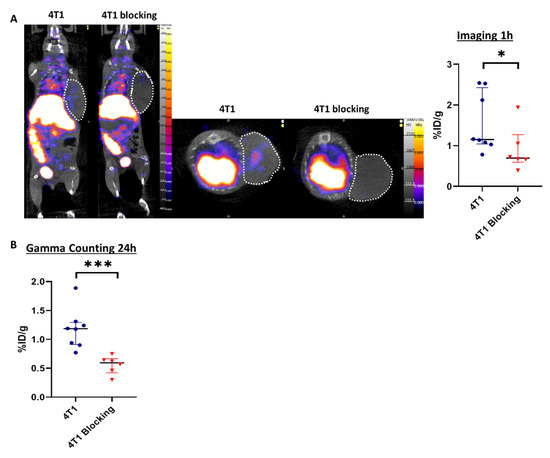 Tilmanocept was radiolabeled with 99mTc and the radiochemical purity of the radiolabeling was checked by radio-ITLC prior to in vivo administration. The results showed a purity above 90%, which was suitable for in vivo experiments (Figure S1), according to the manufacturer’s summary of product characteristics. Two groups of mice were injected with 99mTc-Tilmanocept, one of them also receiving a 20× higher dose of cold Tilmanocept (blocking group) to confirm the specificity of labeling. At 1h post-injection, the 99mTc-Tilmanocept tumor uptake was significantly increased in 4T1 tumors compared to mice receiving a concomitant excess of unlabeled Tilmanocept (1.55 ± 0.30 %ID/g vs. 0.90 ± 0.22 %ID/g, p = 0.0293), thus demonstrating the specificity of this probe for 4T1 tumors (Figure 2A). Ex vivo radioactivity quantification of tumors 24 h post-99mTc-Tilmanocept injection confirmed the increase in 99mTc-Tilmanocept uptake compared with the blocking group (1.18 ± 0.12 %ID/g vs. 0.56 ± 0.10 %ID/g, p = 0.0007) (Figure 2B). These results were also confirmed ex vivo by autoradiography on human TNBC biopsies in which 99mTc-Tilmanocept autoradiogaphic signal was significantly increased compared to biopsies receiving a concomitant excess of unlabeled Tilmanocept (2.079 ± 0.15 AU vs. 1.354 ± 0.26 AU, p = 0.0286) (Figure S2).