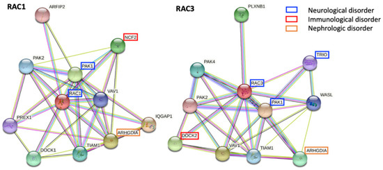Predicted interactions of RAC1 and RAC3 with other proteins according to STRING (https://string-db.org, accessed on 19 October 2021). Some of these interactors are already associated with monogenic human conditions with or without a primary neurological involvement. Among RAC1 interactors, PAK1 (OMIM * 602590) is associated with a NDD with microcephaly, NCF2 (OMIM * 608515) with a chronic granulomatous disorder, and ARHGDIA (OMIM * 601925) with nephrotic syndrome. While PAK1 and ARHGDIA are common interactors to both RAC1 and RAC3, more specific RAC3 interactors with a known role in the pathogenesis of human conditions include TRIO (OMIM * 601893), linked to an autosomal dominant form of intellectual disability with micro- or macro-cephaly, and DOCK2 (OMIM * 603122), whose biallelic variants cause an immunodeficiency disorder.