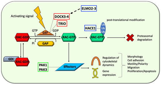 Schematic drawing illustrating selected GEFs (red), regulators (blue), and effectors (green) of RAC proteins which have been associated with human conditions with a primary neurological involvement. The represented categories include: (1) GEFs: DOCK3, DOCK4, and TRIO; (2) regulators: ELMO2, ELMO3, and HACE1; (3) effectors: PAK1 and PAK3. GEFs plays a crucial role in the ‘off-on’ switching of Rac GTPases, regulators are involved in the fine modulation of aspects of Rac proteins function (ELMO2 and ELMO3) and metabolism (HACE1), and effectors are primarily responsible of the downstream effects of Rac signaling (PAK1 and PAK3).