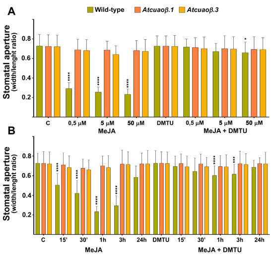 Effect of three different concentrations of MeJA and N,N′-dimethylthiourea (DMTU) (A) and time course analysis of the effect of MeJA and DMTU (B) on stomatal pore width/length ratio of seven-day-old WT, Atcuaoβ.1 and Atcuaoβ.3 mutant seedlings. Seedlings were treated for 1 h with 0.5, 5, or 50 μM MeJA and 100 μM DMTU, either alone or in combination with each hormone concentration (A). Seedlings were treated for 15, 30 min, 1, 3 and 24 h with 50 μM MeJA and 100 μM DMTU, either alone or in combination with the hormone (B). Mean values ± SD (n = 15) are reported. The significance levels between WT control plants and WT treated plants are reported. p levels have been calculated with one-way ANOVA analysis; p levels > 0.05; *, ***, and **** p levels are equal to or less than 0.05, 0.001 and 0.0001, respectively.