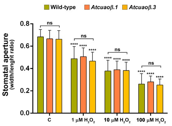 Effect of three different concentrations of H2O2 on stomatal pore width/length ratio of seven-day-old WT, Atcuaoβ.1 and Atcuaoβ.3 mutant seedlings. Seedlings were treated for 1 h with 1, 10, or 100 μM H2O2. Mean values ± SD (n = 15) are reported. The significance levels between the treated plants and the corresponding untreated plants are reported for each treatment, while the significance levels between the WT and Atcuaoβ mutants supplied with the same concentration of H2O2 (horizontal square brackets) are reported. p levels have been calculated with one-way ANOVA analysis; p levels > 0.05; ****, p ≤ 0.0001; ns: non-significant.