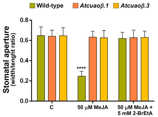 Consistently with these data, treatment with the CuAO-specific inhibitor 2-bromoethylamine (2-BrEtA) blocked the MeJA-mediated stomatal closure in WT plants, restoring the stomatal pore aperture at the same values of the untreated plants, whereas it did not significantly affect stomatal aperture in MeJA-treated Atcuaoβ mutants (Figure 6).