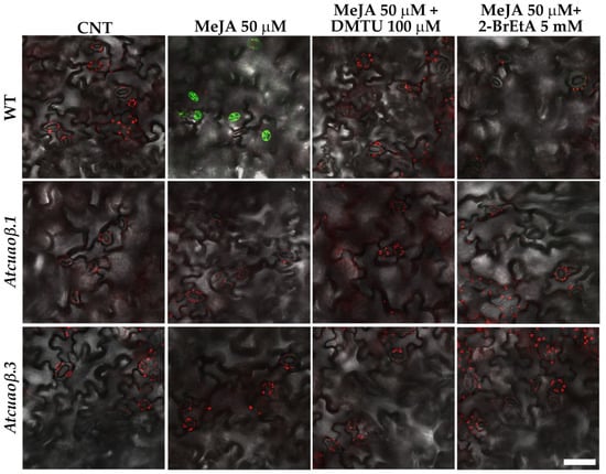 The detection of ROS in guard cells was analysed on seven-day-old WT and Atcuaoβ mutant seedlings grown on solid medium and examined under control conditions and after treatment with 50 μM MeJA, 50 μM MeJA + 100 μM DMTU, 50 μM MeJA + 5 mM 2-BrEtA.