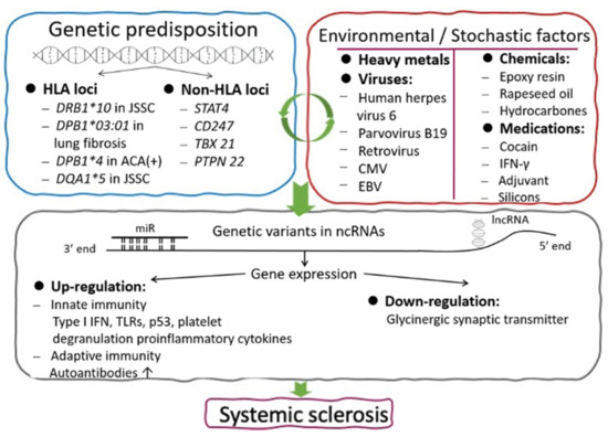 In addition to genetic predisposition, the environmental etiology of SSc has also been extensively investigated since clusters of the disease have been identified among certain occupational groups such as gold miners [51] and silica-induced silicosis [52]. A variety of environmental agents including vinyl chloride [53], hydrocarbons [54], epoxy resins [55], rapeseed oil [56], medications [57], and even heavy metals [58] have been reported. A comprehensive review of potential occupational and environmental factors in SSc onset has been reported by Marie et al. [58]. It is believed that scleroderma is elicited by both genetic and environmental/occupational factors. However, random events or stochastic processes also play pivotal roles in SSc pathogenesis similar to other systemic autoimmune diseases. Roberts-Thomson P.J. and Walker J.G. [59] speculated that these stochastic processes might result in acquired somatic mutations or epigenetic alterations that affect the genes coding for immune receptors, tolerogenic threshold, or proteins involved in immune regulation, inflammation, and/or repair. Genetic predisposition, genetic variants in non-coding regions for regulating gene expression, and environmental/stochastic factors related to SSc are summarized in Figure 1.