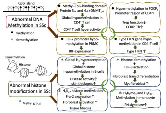 Lei et al. [67] found that global hypomethylation in CD4+T cells in SSc patients was a result of a decrease in DNMT1 and methyl-CpG-binding domain proteins (MBD): MBD3 and MBD4. More specifically, Wang et al. [68] and Almanzar et al. [69] demonstrated that DNA hypermethylation in the FOXP3 promoter subsequently impaired the functions of regulatory T cells (Treg) and caused hyperactivity of CCR6+ Th cells. Coit et al. [70] identified a total of 105 and 144 differentially methylated sites and genes unique for either juvenile SSc (JSSc) and localized SSc including FGFR2, STAT3, NF-κB, IL-15, and NOTCH3 pathways. Baker Frost et al. [71] intended to investigate the association of DNA methylation levels in dermal fibroblasts obtained from patients of African ancestry and found widespread reduced DNA methylation of DLX5 and TMEM140. Rezaei et al. [72] suggested that hypomethylation of IRF7 promotor might play a role in SSc pathogenesis via promoting the IRF7 expression in PBMCs of patients with SSc. Furthermore, Ding et al. [73] unveiled that hypomethylation and the subsequent upregulation of type I interferon-associated genes play a critical role in SSc pathogenesis. Chen et al. [74] concluded that hypomethylation of IFN-related genes in CD4+ T cell is a common epigenetic feature of autoimmune disease including Grave’s disease, rheumatoid arthritis, systemic lupus erythematosus, and SSc patients, and the DNA methylation profile of IFN-related genes could become promising biomarkers for autoimmune diseases.