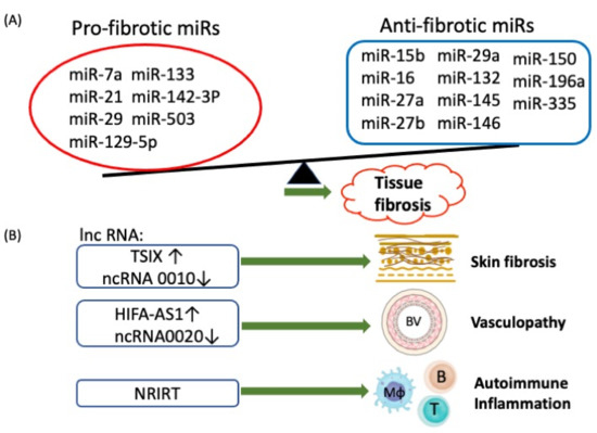 Aberrant ncRNA expressions in SSc including microRNAs (miRs) and long non-coding RNAs (lncRNAs) have been extensively reviewed in the literatures [10,31,79,80,81]. Tsai et al. [10] reviewed the literatures and found an intriguing imbalance relationship between pro-fibrotic miRs and anti-fibrotic miRs towards profibrotic status in SSc. The pro-fibrotic miRs include miR-21, miR-29, miR-129-5P, miR-133, miR-142-3p, miR-503, and let-7a. The anti-fibrotic miRs include miR-15b, miR-16, miR-27a, miR-27B, miR-29a, miR-132, miR-145, miR-146, miR-150, miR-196a, and miR-335. In addition, the differential expression levels of lncRNAs included TSIX, NRIR, ncRNA00201, OTUD6B-AS, CTBP1-AS2, AGAP2-AS1, and HIFA-AS1, which can target mRNAs and might also involve pathogenesis and pathological changes in patients with SSc.