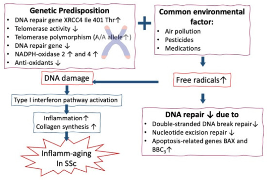 The genetic defects containing the DNA repair gene, telomerase activity, redox genes, and anti-oxidant capacity superimposed by common environmental factors are responsible for increased DNA damage by increased free oxygen radical production in SSc patients. Increased DNA damage then activates type 1 interferon pathway to induce inflammation and collage synthesis mimicking inflamm-aging in patients with SSc. On the other hand, the free radicals may also further impede DNA repair in SSc patients.
