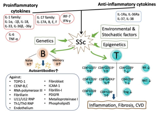 A number of immune cell types were found to have implications in SSc pathogenesis including T cells, B cells, dendritic cells, mast cells, and macrophages. The interactions among different immune cell types in mediating the inflamm-aging of SSc are intriguing. We will discuss in detail the abnormal immunobiological bases of B and T lymphocyte subsets relevant to inflamm-aging.