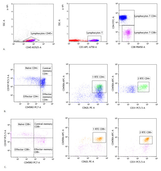 Gating strategy of T lymphocytes maturation in lymph node. (A) Selection of lymphocytes based on their SSC/CD45+ position, CD3 vs. SSC-A plot: Selection of lymphocytes T based on their SSC/CD3+ position. CD4 vs. CD8 plot: Selection of lymphocytes T CD4+ (blue) and CD8+ (purple) based on their CD4+ or CD8+ position. (B) Representative dot plots of T CD4+ subsets cells: naïve CD4+ T cells, effector CD4+ T cells, central memory CD4+ T cells, effector memory CD4+ T cells and recent thymic emigrants T CD4+ cells (gating strategy of RTE T CD4+ cells consist of two plots: 1RTE+ 2RTE - green), based on antibodies described in section: Material and Method. (C) Representative dot plots of T CD8+ subsets cells: naïve CD8+ T cells, effector CD8+ T cells, central memory CD8+ T cells, effector memory CD8+ T cells and recent thymic emigrants T CD8+ cells (gating strategy of RTE T CD8+ cells consist of two plots: 1RTE+ 2RTE - orange), based on antibodies described in Material and Methods).
