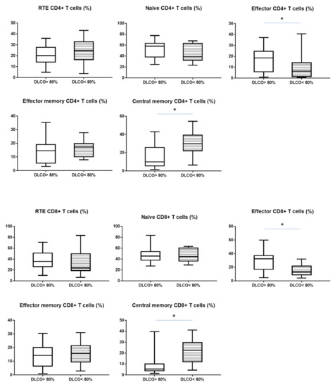 Moreover, we presented the analyses for these cells’ subset in PB in Supplementary Materials. We did not observe differences in the main leukocytes’ subpopulation and T cells maturation subset in PB between patients with DLCO > 80% and DLCO < 80% (Supplementary Materials: Tables S1 and S2). Further analysis compared leukocyte subsets and maturation of T cells were made for LN samples.