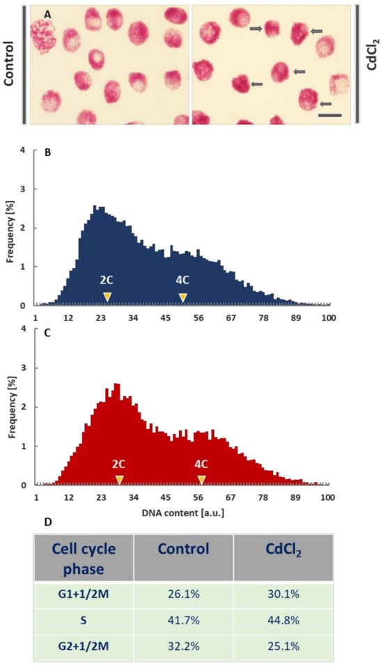 Cytophotometric measurements of nuclear DNA content revealed quite similar quantities of 2C (G1-phase), 2-4C (S-phase), and 4C (G2-phase) cells both in the control (Figure 1B; dark blue histogram) and CdCl2-treated plants (Figure 1C; dark red histogram). After the application of CdCl2, a slight shift to the right of the maximum values for the G1- and G2-phase cell cycle subpopulations was observed. This result is probably due to the increased level of chromatin condensation. It can be noted (Figure 1D) that an increase in the number of the G1 phase cells in CdCl2-treated roots (30.1% compared to 26.1% in the control) is accompanied by a slight increase in the number of cells in the S (44.8% compared to 41.7%) and a more significant rise in the number of G2 phase cells (25.1% compared to 32.2%; Figure 1B–D).