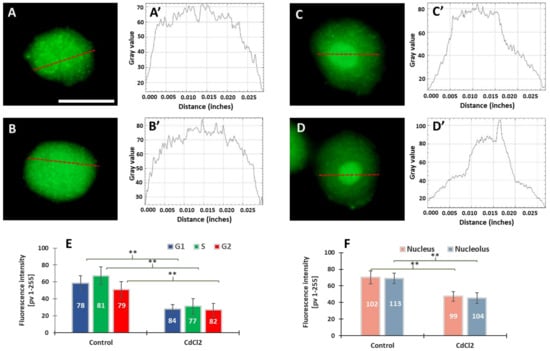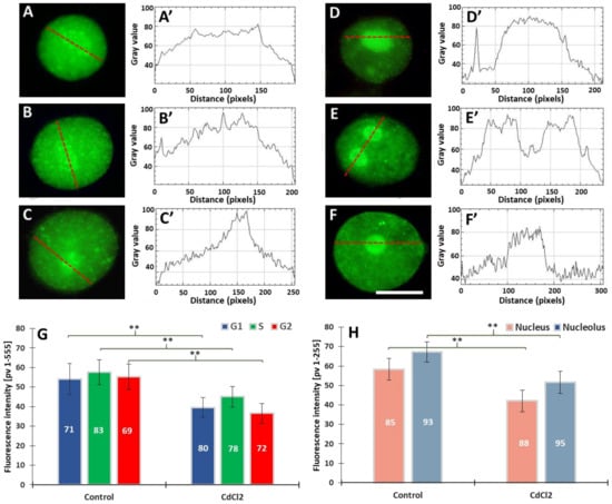 The line plots passing the nucleus throughout the nucleolar region revealed a significantly higher degree of fluorescence, mostly in the cadmium-treated seedlings (Figure 5A’–F’), than that emitted by the extranucleolar chromatin region (Figure 5A–F). As compared to the control, the 24 h incubation with CdCl2 resulted in a 20% decrease in FI in the G1, S, and G2 phases of the cell cycle (Figure 5G). The second analysis revealed a decrease of about 15% in the FI values calculated both for the nuclear and nucleolar chromatin (Figure 5H).