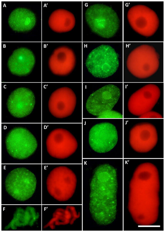Different labeling patterns observed in cell nuclei after immunostaining with antibodies against H3T45Ph conjugated with Alexa Fluor®488 ((A–K); green fluorescence) and corresponding images of cell nuclear DNA stained with propidium iodide ((A’–K’); red fluorescence). The control cells (A–F’) revealed predominant nucleolar staining of H3T45Ph (A–B’), localization of H3T45Ph within the internal areas of interphase chromatin (C–D’) and prophase (E,E’), and labeling of the chromosomal areas corresponding to the nucleolus-organizing regions (NORs) during prometaphase (F,F’). The CdCl2-treated cells show predominant nucleolar staining in cell nuclei (G,G’), specific labeling around nucleoli (H–I’), and localization of H3T45Ph within the internal areas of interphase chromatin (J–K’).