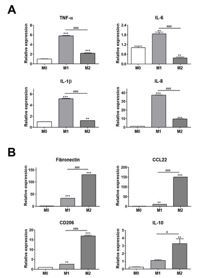 Validation of THP-1 cell differentiation to M1 or M2 macrophages. (A) Gene expression levels of M1 polarization markers (TNF-α, IL-6, IL-1β, and IL-8) and (B) M2 polarization markers (fibronectin, CD206, IL-10, and CCL22). ** p < 0.01 and *** p < 0.001 indicate statistically significant differences compared with the M0 group. n = 4 trials per samples and control. # p < 0.05 and ### p < 0.001 indicate statistically significant differences between M1 and M2 macrophages.