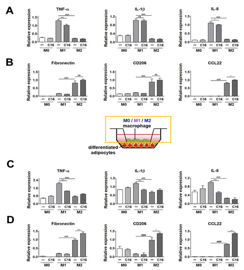 Expression levels of M1 and M2 polarization markers in THP-1 cells co-cultured with differentiated adipocytes upon additional CXCL16 treatment. (A) Gene expression levels of M1 polarization markers (TNF-α, IL-1β, and IL-8) and (B) M2 polarization markers (fibronectin, CD206, and CCL22) in THP-1 cells upon CXCL16 treatment. n = 3 trials per samples and control. (C) Gene expression levels of M1 polarization markers (TNF-α, IL-1β, and IL-8) and (D) M2 polarization markers (fibronectin, CD206, and CCL22) in THP-1 cells co-cultured with differentiated adipocytes upon additional CXCL16 treatment. n = 5 trials per samples and control. * p < 0.05 and *** p < 0.001 compared with macrophages without CXCL16 treatment. ### p < 0.001 indicate statistically significant differences between M1 and M2 macrophages. Not significant, ns.