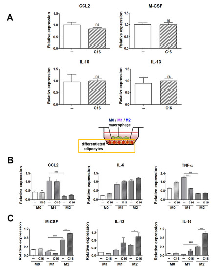 Expression levels of M1 and M2 polarization-inducing factors on differentiated adipocytes upon additional CXCL16 treatment. (A) Gene expression levels of M1 polarization-inducing factors (CCL2) and M2 polarization-inducing factors (M-CSF, IL-10, and IL-13) in adipocytes upon CXCL16 treatment. n = 3 trials per samples and control. (B) Gene expression levels of M1 polarization-inducing factors (CCL2, IL-6, and TNF-α) and (C) M2 polarization-inducing factors (M-CSF, IL-10, and IL-13) in differentiated adipocytes co-cultured with THP-1 cells upon additional CXCL16 treatment. n = 5 trials per samples and control. * p < 0.05, ** p < 0.01 and *** p < 0.001 compared with adipocytes without CXCL16 treatment. ### p < 0.001 indicate statistically significant differences between adipocytes co-cultured with M1 or M2 macrophages. Not significant, ns.