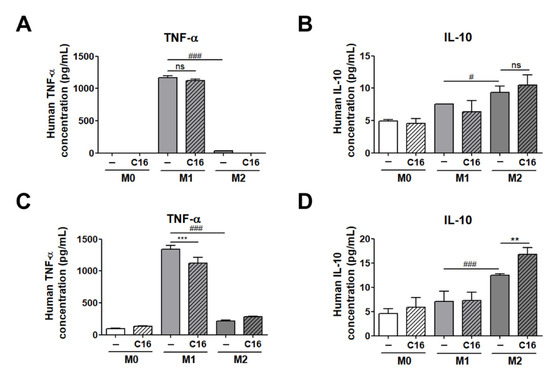 The secretion levels of TNF-α and IL-10 in cell culture media of THP-1 cells and THP-1 cells co-cultured with differentiated adipocytes. (A) Secretion levels of TNF-α and (B) IL-10 in a cell culture medium in THP-1 cells and the secretion levels of (C) TNF-α and (D) IL-10 in a cell culture medium of co-cultured THP-1 cells upon additional CXCL16 treatment. n = 5 trials per samples and control. ** p < 0.01 and *** p < 0.001 compared with samples without CXCL16 treatment. # p < 0.05 and ### p < 0.001 indicate statistically significant differences between M1 and M2 macrophages. Not significant, ns.