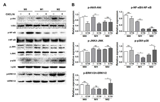 The activation of the Akt/NF-κB pathway significantly decreased in differentiated adipocytes in the presence of THP-1 cells polarized into M1 macrophages with additional CXCL16 treatment. In contrast, ERK1/2 and p38 MAPK, but not JNK, were activated in differentiated adipocytes in the presence of THP-1 cells polarized into M2 macrophages.