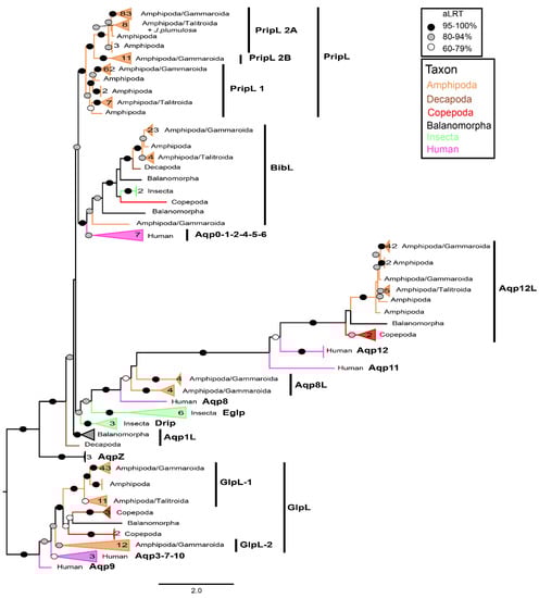 - Stavang, J.A.; Chauvigné, F.; Kongshaug, H.; Cerdà, J.; Nilsen, F.; Finn, R.N. Phylogenomic and functional analyses of salmon lice aquaporins uncover the molecular diversity of the superfamily in Arthropoda. BMC Genom. 2015, 16, 618. [Google Scholar] [CrossRef] [PubMed] [Green Version]