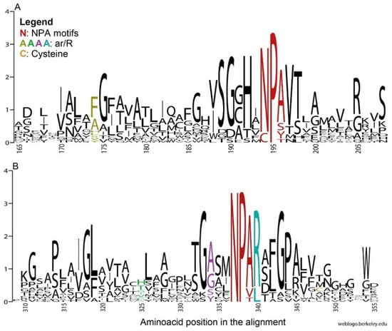 - Soto, G.; Alleva, K.; Amodeo, G.; Muschietti, J.; Ayub, N.D. New insight into the evolution of aquaporins from flowering plants and vertebrates: Orthologous identification and functional transfer is possible. Gene 2012, 503, 165–176. [Google Scholar] [CrossRef]