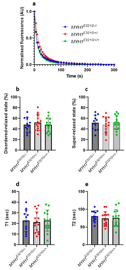 Super-relaxed myosin molecules have very low ATPase activity in comparison to its other conformational states (e.g., disordered-relaxed state) [16]. By using this assumption and the Mant-ATP chase protocol [16], in the present study, we assessed the proportion of myosin heads in the super-relaxed or disordered-relaxed states and did not observe any significant differences between muscle fibres from MYH1E321G+/+ (n = 14), MYH1E321G+/− (n = 15) and MYH1E321G−/− (n = 12) horses (Figure 1a–c). Similarly, the lifetimes of ATP turnover of myosin in the super-relaxed or disordered-relaxed states were unchanged between the groups (Figure 1d,e).