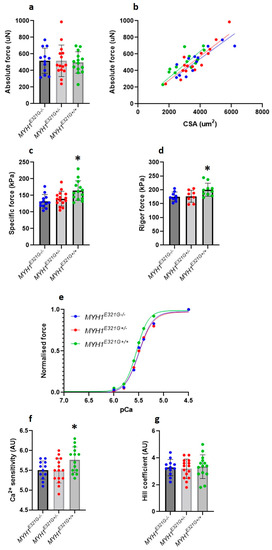 Contractile properties of isolated myofibres. (a) Absolute force. (b) Absolute force–myofibres cross-sectional area (CSA) relationship. The maximal (c) and rigor (d) (specific) force production was higher in MYH1E321G+/+ when compared to MYH1E321G+/− and MYH1E321G−/− animals. (e) Typical data depicting the force generating at various Ca2+ concentrations (pCa) for myofibres from MYH1E321G+/+, MYH1E321G+/− and MYH1E321G−/− animals. (f) The Ca2+ sensitivity (pCa50) was greater in MYH1E321G+/+ when compared to MYH1E321G+/− and MYH1E321G−/− horses. (g) The Hill coefficient or cooperativity (nH) was not different between the groups. Dots are individual muscle fibre data. Means and standard deviations also appear on histograms. Stars represent a significant difference with MYH1E321G−/− horses (* p < 0.05).